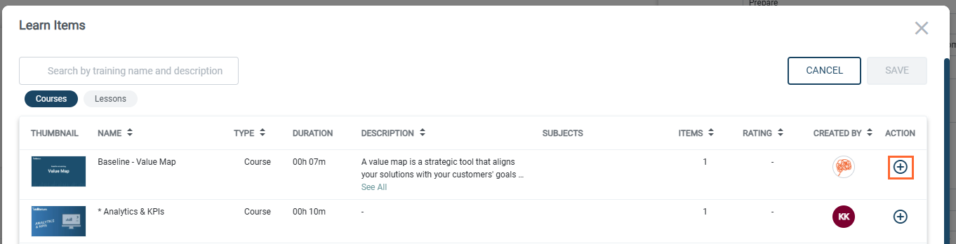 - Use the search bar to filter the training item, or use the filter pills.