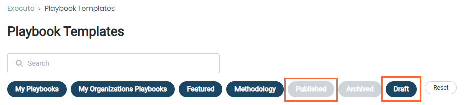 - Unselect the Published filter pill and select the Draft filter pill to filter your view to only Playbooks that are in draft mode.