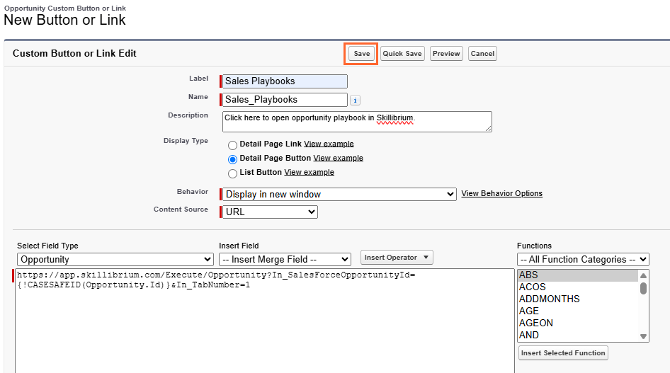 - Configure your custom button, add the appropriate link and click Save. (example link: https://app.skillibrium.com/Execute/Opportunity?In_SalesForceOpportunityId={!CASESAFEID(Opportunity.Id)}&In_TabNumber=1) *