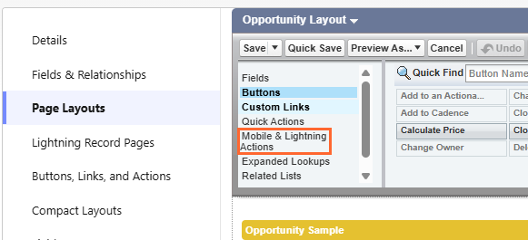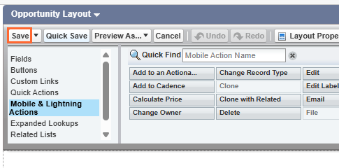 - Drag the new button to the Sales Mobile and Lightning Experience Actions area.