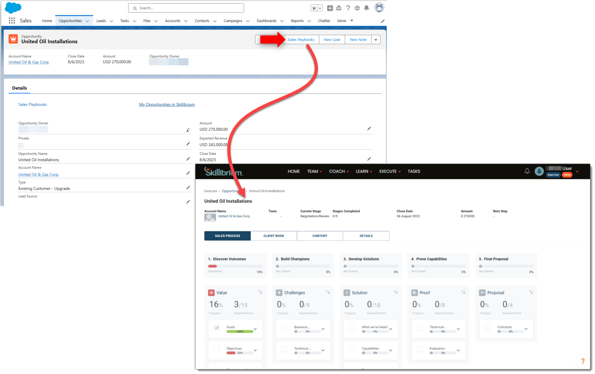 To eliminate the need for manual lookups and navigation between systems, Salesforce system administrators can create custom buttons within Salesforce that link directly to the corresponding opportunity page in Skillibrium. When a user clicks the custom button on a Salesforce opportunity, the corresponding Skillibrium opportunity playbook opens instantly.