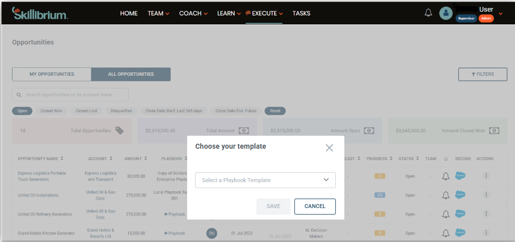 Applicable Roles: Administrators Skillibrium Execute provides customizable sales process playbook templates that can be used to enrich opportunities. Only Skillibrium administrators can set up opportunity playbooks templates within Skillibrium. ...