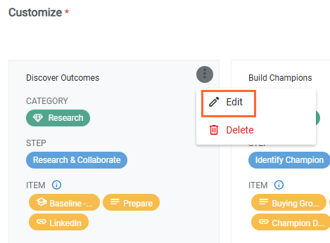 Each stage in an opportunity playbook template can be configured by adding new categories, steps, items, and follow-up questions.